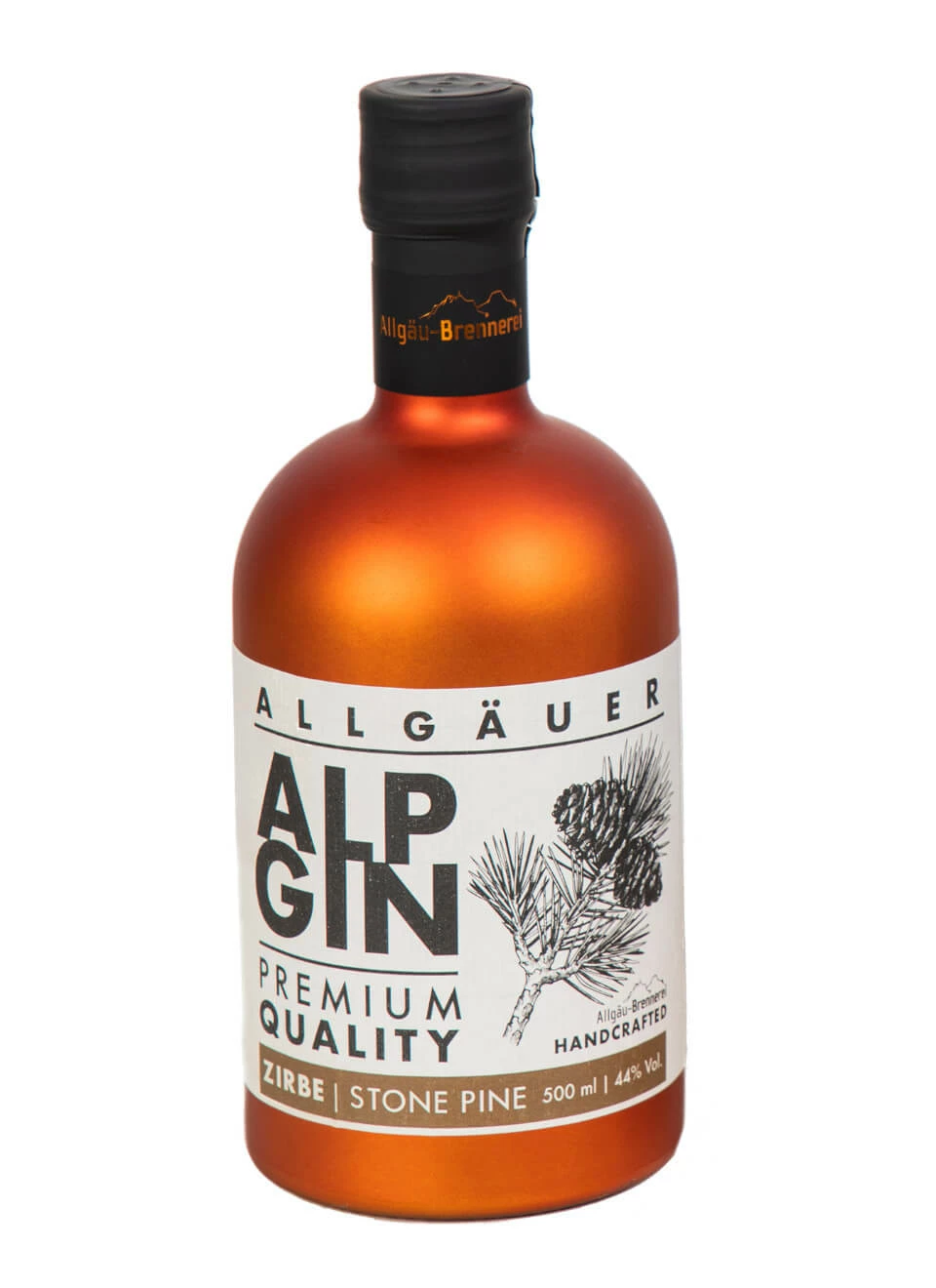 Gin mit Zirbelkieferzapfen von von der Allgäu-Brennerei in der 0,5 Liter Flasche mit 44% Vol. Alc.
