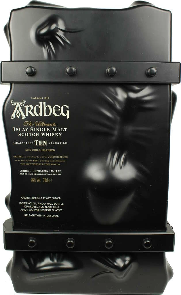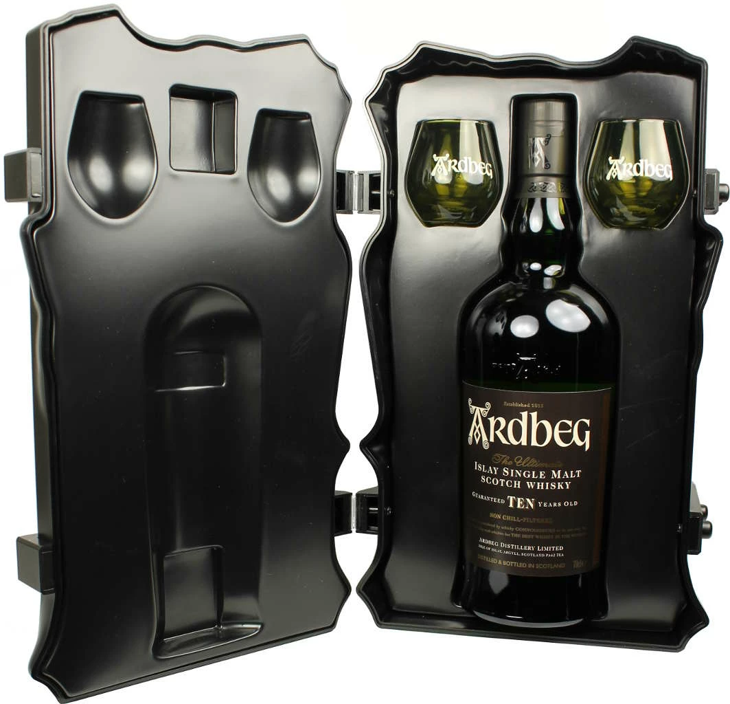 Whisky von Ardbeg in 0,7 l Flasche mit 46 %Vol. Alc. mit Farbstoff mit Gläsern
