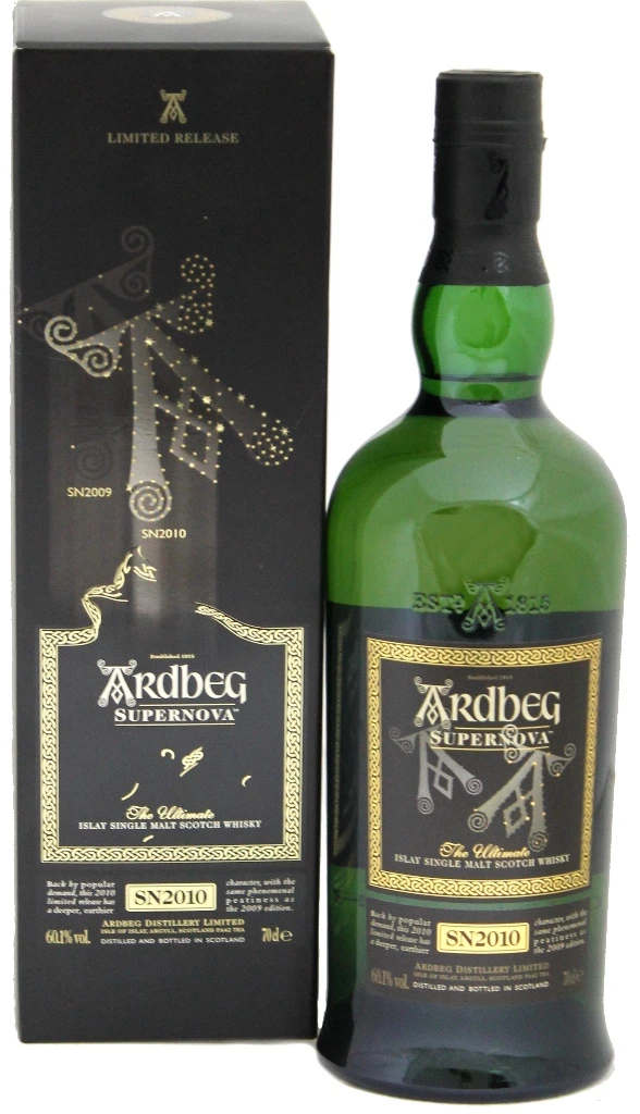 Der Ardbeg Supernova wurde erstmals 2009 abgefüllt, und zwar mit einem Alkoholgehalt von 58,9%, diese Abfüllung ist mittlerweile nur noch in Restbeständen bei uns erhältlich. Für seine überragenden Qualitäten wurde er vom Whisky-Papst Jim Murray in seiner berühmten „Whisky Bible“ als „Best Scotch Whisky of the Year“ ausgezeichnet, womit die Ardbeg-Destillerie diesen begehrten Titel nun schon zum dritten Mal erhielt.