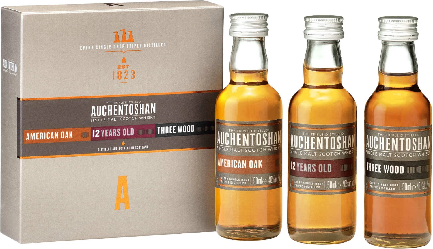 Whisky von Auchentoshan in 3 x 5cl Flaschen mit bis zu 43 % Vol. Alc. mit Farbstoff