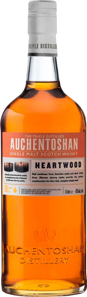 Der Auchentoshan Heartwood ist ein Single Malt Whisky für alle, die das Besondere lieben. Wie sämtliche Whiskys der Auchentoshan Destille ist auch dieses Malz nur leicht getorft. Sein Geschmack eröffnet mit einer unterschwelligen, leichten Süße, die später in kräftige Furchtaromen übergeht. Auch der Abgang ist sehr fruchtig, dunkel und trocken. Sein Aroma erinnert an kräftigen, würzigen Cappuccino. Das Besondere am Auchentoshan Heartwood Whisky ist seine Reifung in zwei unterschiedlichen Fässern. Er wird sowohl in Oloroso-Sherry- als auch Bourbonfässern gelagert und erhält dadurch einen besonders harmonischen Geschmack, der seinesgleichen sucht. Der Auchentoshan Heartwood ist demnach ein Whisky, der in keiner Whiskykenner-Bar fehlen und am besten pur genossen werden sollte. Denn wie alle hochwertigen Single-Malts ist auch der Heartwood zum Mixen viel zu schade.