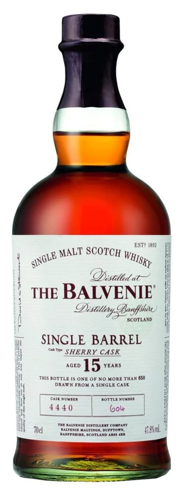Der 15-jährige Balvenie Single Barrel Sherry Cask wird, wie der Name sagt, in Mengen von etwa 350 Flaschen pro Fass aus einzelnen Fässern abgefüllt, die einzeln nummeriert werden. Dieser Scotch Whisky ist einfach gebrannt und wird in den begehrten, ehemaligen Sherry Fässern gelagert. Die Abfüllung erfolgt bei einem Alkoholgehalt von 47,8 %. Bedingt durch die Herkunft unterliegt der Geschmack gewissen Abweichungen je nach dem Fass, aus welchem er stammt.