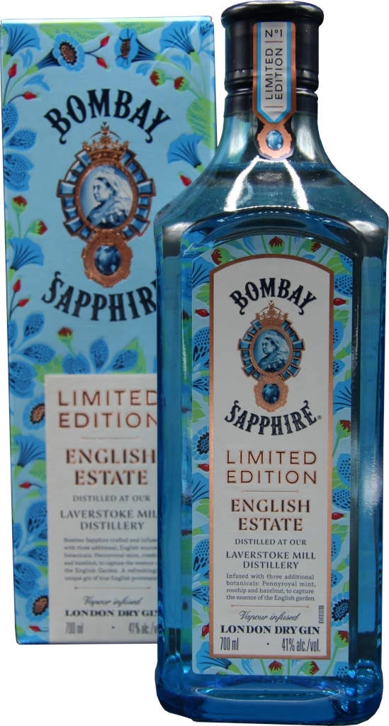 Bombay Sapphire Gin English Estate in der 0,7l Flasche in Geschenkpackung mit 41% Vol.Alc. mit Farbstoff