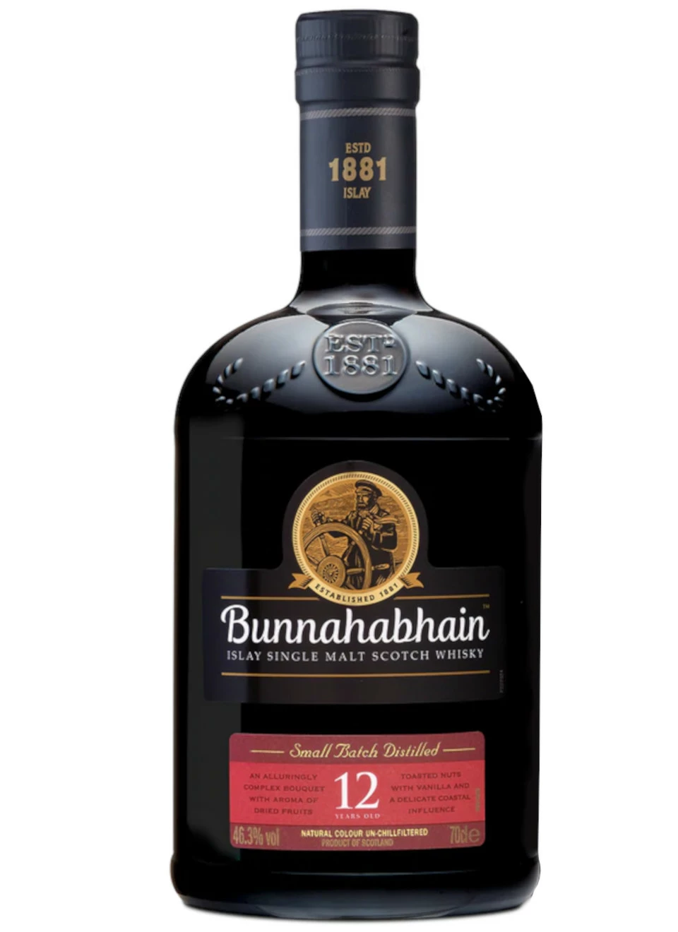 Für Islay-Whiskys ist der Bunnahabhain 12 yrs.,erstaunlich wenig getorft – sein Charakter wird vielmehr von salziger Seeluft bestimmt, was sich durch die Lage der Brennerei in Port Askaig erklärt. Auch das Etikett, das einen Steuermann zeigt, der nach seinem Heimathafen Port Askaig Ausschau hält, verweist auf diese Herkunft.