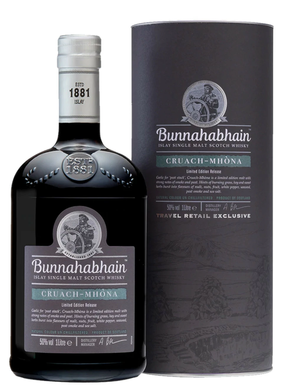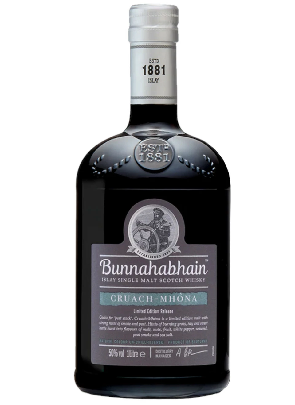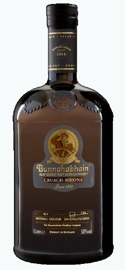 Bunnahabhain Cruach Mhóna in der 1-Liter-Flasche ist ein getorfter Single Malt Scotch Whisky von der weltberühmten Whisky-Insel Islay, die zu den Inneren Hebriden gehört. Gegründet wurde die Brennerei 1881 durch die Gebrüder Greenlees in Port Askaig an der Mündung des Flusses Margadale an der Nordküste von Islay – „Bunnhahabhain“ bedeutet in der gälischen Sprache tatsächlich so viel wie „Flussmündung“! Seit 1887 im Besitz der Highland Distilleries, kam die Brennerei 2003 zu Burn Stewart.