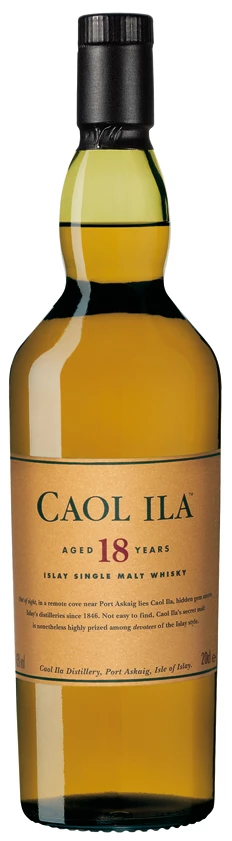 Der Caol Ila 18 yo hat 18 Jahre Fasslagerung hinter sich und wird hier in einer kleinen 0,2-Liter-Flasche und einem Alkoholgehalt von 43% angeboten. Dieser Whisky hat auf der International Wine & Spirit Competition in den Jahren 2004 und 2005 jeweils eine Goldmedaille erhalten. Er zeigt im Glas eine hellgoldene Farbe und entwickelt ein komplexes Aroma, das von würzigen und rauchigen Noten dominiert wird, ergänzt von fruchtigen Zitrustönen. Im Geschmack von leichter Süße mit Hinweisen auf Mandeln und etwas Torf. Der lange Abgang überzeugt durch seine komplexe Ausgewogenheit, wie man sie von einem Single Malt Whisky dieses Alters erwarten darf.