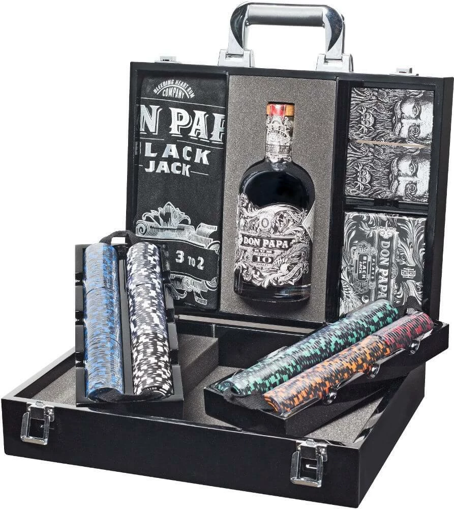 Mit diesem Set ist bereits die Hälfte für einen wundervollen Abend im Kreis der besten Freunde vorbereitet. Enthalten ist ein Black Jack Koffer in edlem schwarzem Design mit Jetons und Spielkarten. Dazu und als besonderes Highlight kommt eine Flasche des wundervollen Don Papa Rums 10 Jahre.