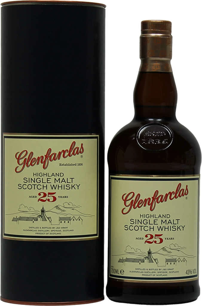 Der Glenfarclas 25 Years Single Malt Whisky ist eines der Spitzenprodukte, der reich an qualitativ Hochwertigem, Brennerei J & G Grant Glenfarclas, im schottischen Hochland. Der 25 Jahre alte Glenfarclas Whisky weist einen Alkoholgehalt von 43 % auf und besticht mit seiner Farbe im satten Bernstein, die dunkelgoldene Höhepunkte zeigt. Die langjährige Lagerung und Reifung in gebrauchten Sherryfässern verleiht diesem außergewöhnlichen Whisky sein volles, komplexes Aroma, das an Marmelade, frischen Kaffee und Honig erinnert. Spuren von eingebundenen Tanninen, Nüssen und Sherry sind erkennbar. Vom Geschmack her überzeugt die volle Reife, die eine milde Süße durchkommen lässt, ohne aufdringlich zu wirken. Es überwiegt der fein torfige Touch, der sich mit den geschilderten Aromen zu einem einzigartigen Geschmackserlebnis verbindet. Im Abgang ist der Glenfarclas 25 Years Old ausgesprochen intensiv und lang, lässt einen leicht schokoladigen Hauch erkennen und überzeugt mit einem ausdauernden, rauchigen Malzgeschmack.