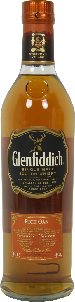 Mit dem Glenfiddich 14 Jahre Rich Oak wurde ein typischer Rich Oak Whisky der Brennerei auf den Markt gebracht, der ganze 14 Jahre in Eichenfässern reift und dadurch sein ganz eigenes Aroma erhält. Die dunkle, goldene Farbe des Rich Oak ist im Glas sehr mächtig und präsentiert spannende Noten von getrockneten Aprikosen, Vanille, Toffee und Eiche, die Lust auf mehr machen. Im Mund breiten sich sofort die Vanille und die Würze des Eichenfasses aus und umspielen aufgrund der 40 Prozent sanft den Gaumen ohne störend zu wirken. Der Abgang dominiert mit Früchten und sanften Komplexität aus den restlichen Aromen, die sich temperamentvoll auf der Zunge vereinen. Der Glenfiddich Whisky ist ein Geschmackserlebnis aus Schottland, das langsam und pur genossen werden sollte. Er kann als Alternative on the rocks getrunken werden, da die Kühle fasziniert.