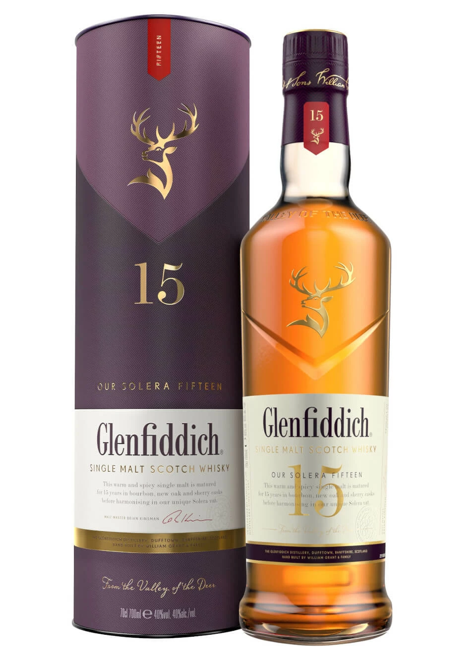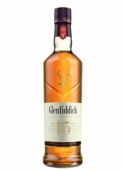 Der Speyside Single Malt Glenfiddich 15 yrs. wird in drei verschiedenen Fässern gelagert, darunter gebrauchten Sherry-Fässern sowie neuen und gebrauchten Eichenfässern. Nach der Vermählung in großen Solera-Fässern erfolgt die Abfüllung, wie bei allen Produkten dieses Hauses, direkt in der Brennerei. Der Alkoholgehalt für diesen Speyside Single Malt von Glenfiddich liegt bei 40%. Er zeichnet sich durch eine hellgoldene Farbe und ein sehr intensives Aroma nach Eiche, Nelken und Honig aus. Der Scotch überrascht in der Nase durch ein herzhaftes Bouquet, das mancher andere Scotch vermissen lässt. Trotz des wuchtigen Körpers ist dieser Whisky erstaunlich geschmeidig mit deutlichen Vanille-Tönen, die er von den Sherry-Fässern mitbekommen hat. Dazu gesellen sich explizite Noten von Gewürznelken und Honig, die diesem Speyside Single Malt einen langen und sanften Abgang verleihen.