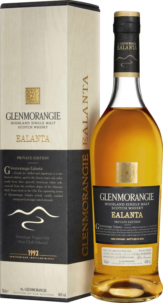 Der Glenmorangie Ealanta wurde 1993 destilliert und reifte 19 Jahre lang in neuen Fässern aus amerikanischer Weißeiche aus dem Mark Twain National Forest, bevor er 2012 mit dem für Glenmorangie typischen Alkoholgehalt von 46 % und ohne vorherige Kühlfilterung abgefüllt wurde. „Mastermind“ hinter diesem für schottischen Whisky außergewöhnlichen Verfahren ist der gelernte Biochemiker Dr. Bill Lumsden, der bereits für die anderen Private Edition-Abfüllungen verantwortlich zeichnet. Seine Kreationen erfreuen sich bei Sammlern größter Wertschätzung, was auf der anderen Seite allerdings bedeutet, dass die limitierten Auflagen jeweils sehr schnell vergriffen sind: Auch wir können nur ein sehr begrenztes Kontingent zur Verfügung stellen – denken Sie bei Ihrer Bestellung bitte daran!