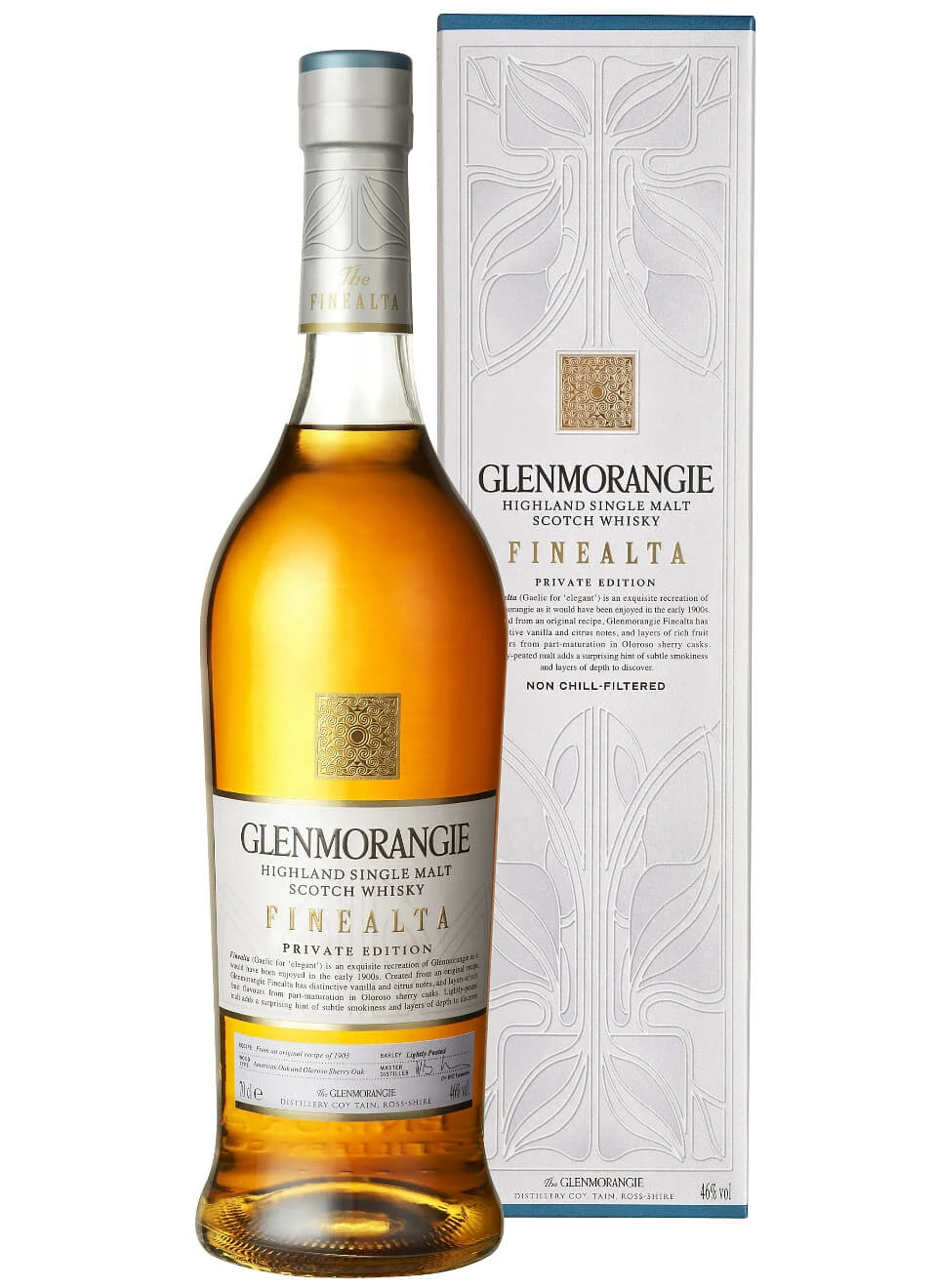 Abgefüllt wird der Glenmorangie Finealta nach einer farblichen Anpassung mit Zuckercouleur in die für die Brennerei typischen, elegant geformten Flaschen zu 0,7 Liter Inhalt mit einem Alkoholgehalt von 46%, worin er vielen anderen Whiskys von Glenmorangie gleicht. Doch damit hören die Ähnlichkeiten auch auf.