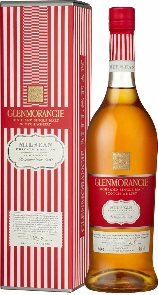 Glenmorangie zählt ohne Zweifel zu unseren liebsten Highland Whiskys und der siebte Whisky der Private Edition Reihe, Glenmorangie Milsean, bildet da keine Ausnahme. Schon optisch finden wir ihn erfrischend anders, was das Flaschendesign betrifft, beinah wie ein edles Vintage Bonbonpapier in Creme und Liebesapfelrot. Das wiederum scheint eine gelungene Umsetzung dessen zu sein, was das Milsean im Namen bedeutet. Denn das schottisch-gälische Milsean meint so viel wie „Süßes“ oder „süße Dinge“ und spielt auf sein Aroma nach kandierten Früchten an.