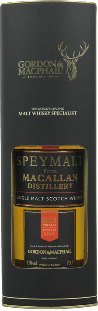 The Macallan 2003 Speymalt ist eine weitere nur in sehr begrenzter Menge verfügbare Edition des bekannten unabhängigen Abfüllers Gordon & MacPhail. Seit seiner Gründung in Elgin im Jahr 1895 hat sich die heute im Besitz der Familie Urquhart befindliche Firma auf die Abfüllung und den Vertrieb exklusiver Single Malt Whiskys spezialisiert, die man anderswo nicht bekommt – nicht einmal in der jeweiligen Brennerei selbst!