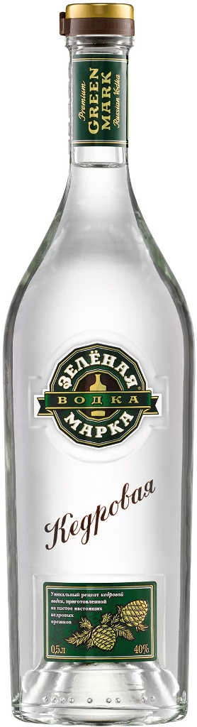 Trotz der modernen Einrichtung wird der Green Mark Vodka nach traditionellen Methoden ausschließlich aus unbehandeltem russischen Weizen hergestellt und erhält durch Silber- und Platinfilter seine außergewöhnliche Reinheit und Klarheit. Die Abfüllung erfolgt mit 40% Alkoholgehalt. Seinen Namen „Green Mark“ erhielt dieser Vodka von dem grünen Qualitätssiegel, das schon zu Sowjetzeiten nur nach äußerst strengen staatlichen Qualitätskontrollen verliehen wurde. Dieses grüne Siegel ist auf jeder Flasche Green Mark Cedar Nut Vodka abgebildet.