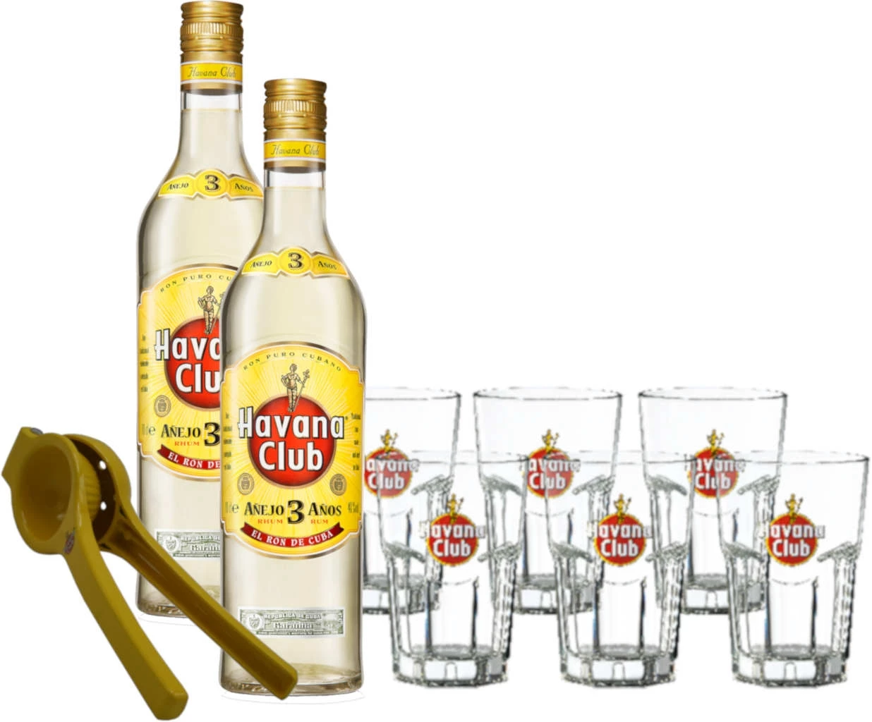 Rum von Havana Club in der 0,7 l Flasche mit 40% Vol. Alc. mit Farbstoff mit 6 Gläsern und einer Limettenpresse