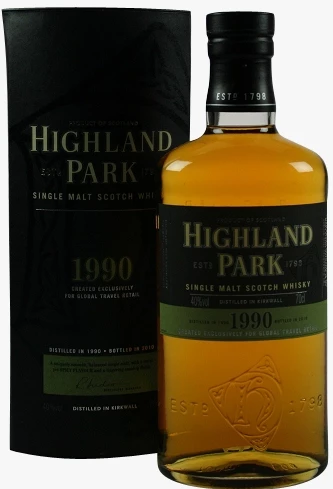 Highland Park Vintage 1990 ist ein Spitzen-Jahrgangswhisky aus der nördlichsten Whisky-Destillerie der Welt, gelegen in Kirkwall auf der zu den Orkneys gehörenden Insel Mainland. Die Brennerei wurde 1825 von Robert Borwick am Ort einer schon früher dort bestehenden Schwarzbrennerei errichtet und verblieb für viele Jahrzehnte im Besitz der Familie Borwick. Nach der Übernahme durch James Grant 1890 wurde ihre Kapazität erweitert, was aber nicht verhinderte, dass Highland Park zwischen 1918 und 1937 stillgelegt wurde. Heute ist Highland Park Teil der in Glasgow ansässigen Edrington-Group, zu welcher auch The Famous Grouse, Cutty Sark und The Macallan gehören.