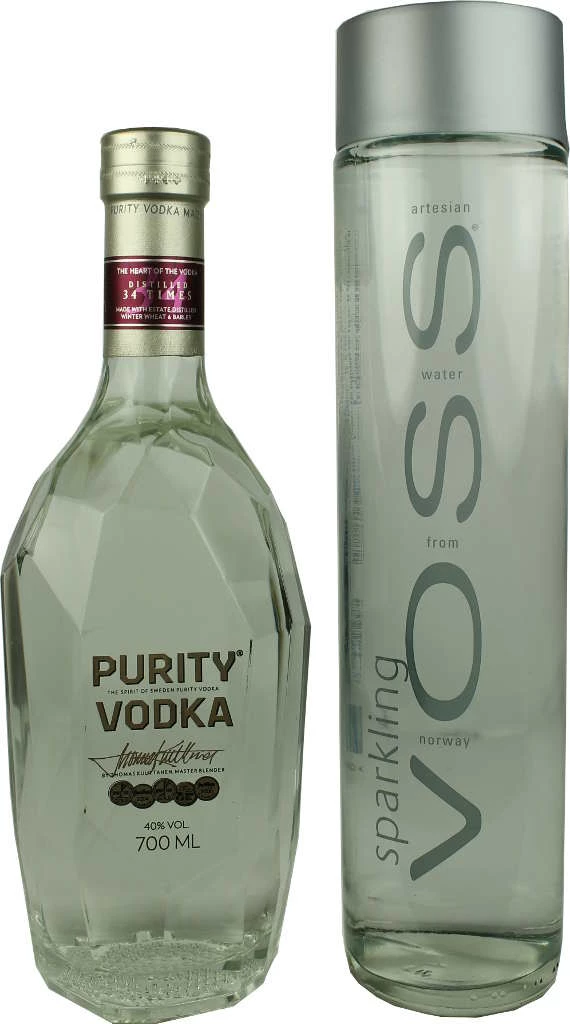 Vodka von Purity Vodka in 0.7l Flasche mit 40 %Vol. Alc. und Wasser von Voss in der 0,8l Flasche mit 0%Vol.Alc. zzgl. 25c Pfand