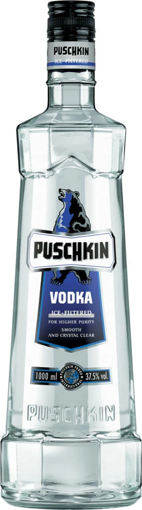 Puschkin Vodka wird in einer 1 Liter Flasche abgefüllt, der Flaschenkörper ist dabei ansprechend designed und bildet mit dem Bären auf der Frontseite einen echten Hingucker.
