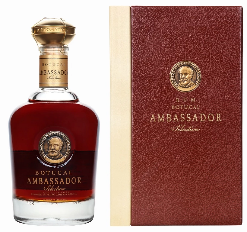 Der Ron Botucal Ambassador wird aus reiner Melasse destilliert und danach 12 Jahre lang zur Reifung in Eichenfässern verwahrt. Anschließend reift er noch 2 Jahre in ehemaligen Sherryfässern. Im Geruch zeigt dieser kräftig-braune Rum Aromen von kandierten Früchten und Vanille. Dazu gesellen sich Gewürze und hintergründig auch Rauch. Im Geschmack spiegeln sich diese Eindrücke sehr ausgeglichen wieder, wobei sich dazu auch noch dunkle Schokolade, Kaffee und Trockenobst zeigen. Der Nachklang ist sehr anhaltend, kräftig und warm. Der Alkoholgehalt liegt bei 47 %.