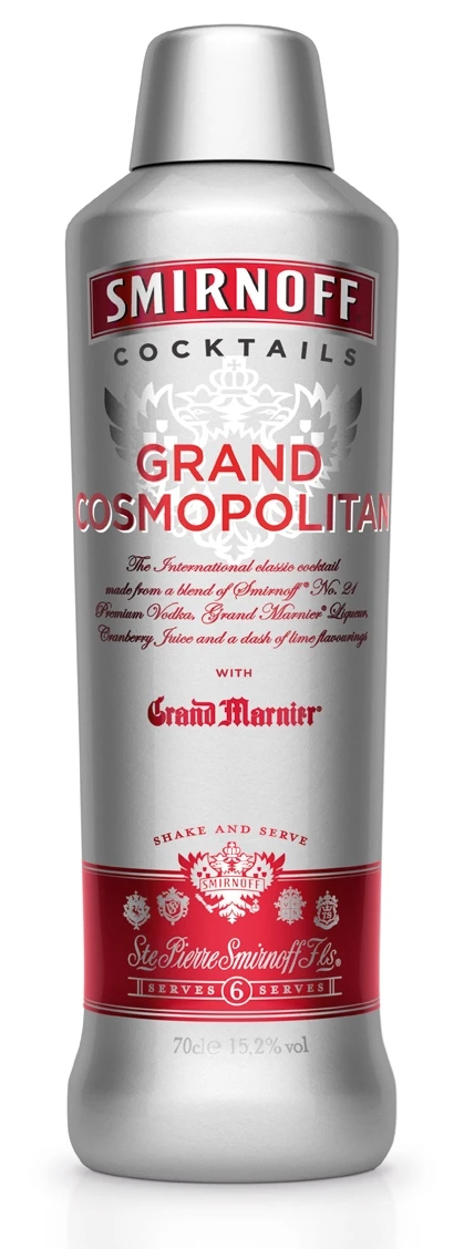 Der Fertigcocktail Cosmopolitan von Smirnoff ist eine servier-bereite Version eines Cocktail-Klassikers. In den 1970ern von Barkeepern in San Francisco entwickelt, erfreute er sich schnell großer Beliebtheit. Spätestens durch die Fernsehserie Sex and the City wurde der Cosmopolitan in den 1990ern auf der ganzen Welt berühmt. Die Zutaten sind Wodka, Triple Sec, Limettensaft und Cranberry Saft. Letzterer gibt dem Drink auch seine markante pinke Farbe. Serviert wird der Cocktail klassischer Weise in einem Martini-Glas.
