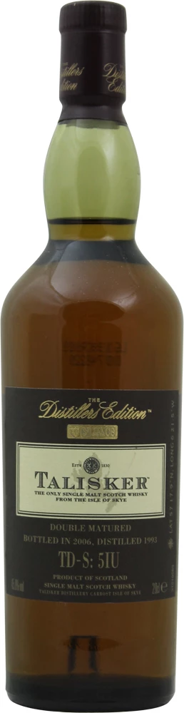 Die Talisker Distillers Edition wurde 2000 destilliert und anschließend bis ins Jahr 2011 in Fässer gegeben. Ihren außergewöhnlichen Charakter verdankt diese Ausgabe dem „double wood“ Verfahren: nach einer langen Lagerung in ehemaligen Bourbon-Fässern wurde der Whisky in Fässer umgefüllt, die zuvor Amoroso-Sherry enthielten. Dieser zu den Olorosos gehörende spanische Sherry zeichnet sich durch einen besonders schweren und dunklen Charakter aus und verfügt über ein ausgeprägt nussiges Aroma. Durch diese Nachreifung nimmt dieser Single Malt Geschmacks- und Farbnuancen auf, die ihn von anderen Ausgaben der Destillerie abheben. Abgefüllt wurde er mit einem Alkoholgehalt von 45,8%.