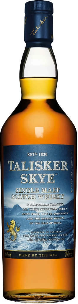 Talisker Skye Whisky ist einer der bekanntesten schottischen Whiskys und wird, da er auf der Insel Skye hergestellt wird, der Whisky Region „Isles“ zugeordnet. Talisker zählt gemäß Diageo zu den „Classic Malts of Scotland“, einer Reihe an klassischen Vertretern der schottischen Whisky Gegenden. Die Nähe zur Insel Islay (bekannt für ihre torfigen Malts) und auch zum windumtosten Meer verleihen Talisker einen ganz eigenen Charakter, der durchaus rauchig und reich an Aromen zu nennen ist. Die Skye Version des Hauses reiht sich seit 2015 in eine Reihe an No-Age Whiskys, die zuvor von Talisker Storm, Dark Storm und Port Ruighe angeführt worden war.