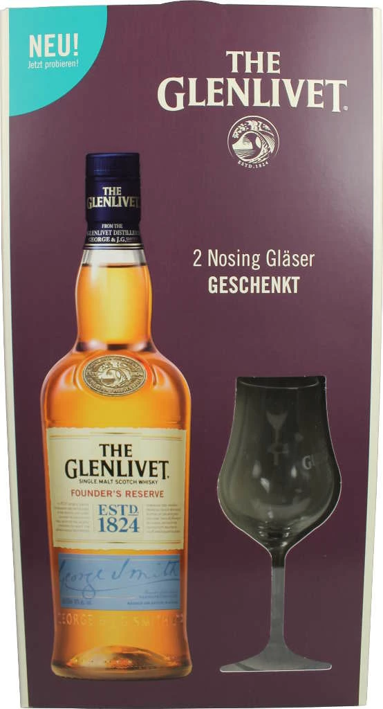 The Glenlivet Founders Reserve ist der offizielle Nachfolger des bekannten und beliebten 12 Jahre alten Glenlivet Whiskys. Doch nicht nur deshalb ist dieser Whisky etwas Besonderes. Der Name „Founders Reserve“ erinnert an den lange verstorbenen George Smith, der im Jahre 1824 die Glenlivet Brennerei gründete, daher auch das georgianische Blau auf der Flasche. Aus diesen beiden Gründen stellt diese Spirituose eine Spezialität dar. Und so ist hier nicht nur die Flasche Founders Reserve enthalten, sondern zusätzlich noch zwei Nosing Gläser, die sich besonders gut für eine Geruchsprobe der erlesenen Flüssigkeit eignen.
